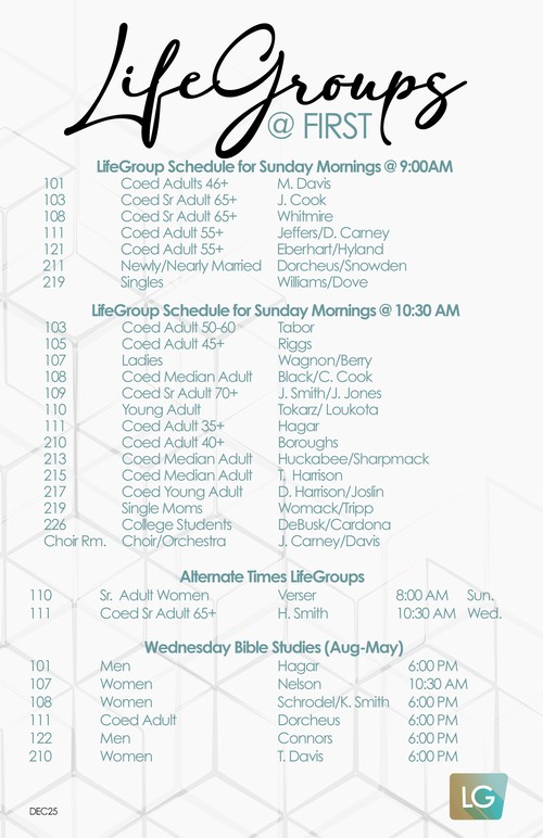 It is the mission of our adult LifeGroups to teach members to observe all things whatsoever Christ commanded and reach and engage our community for Christ together. Most adult LifeGroups meet on Sunday mornings at 9:00 AM or 10:30 am. There are children's sunday school and activities during the 9:00 AM and 10:30 AM times. A variety of LifeGroups are available to meet the needs of adults of all ages, interests and life stages. Below, is a list of our current LifeGroups.