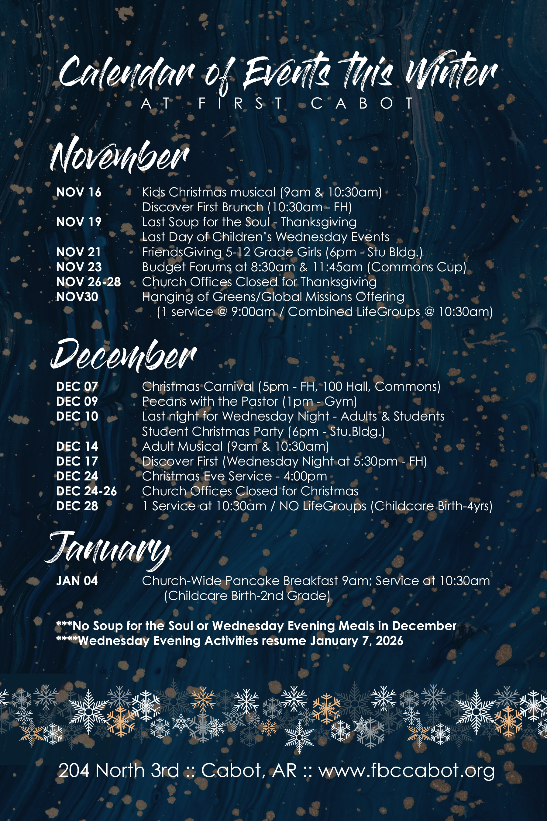 There's so much happening this December at First Cabot...Click the link below to view the whole calendar of events!